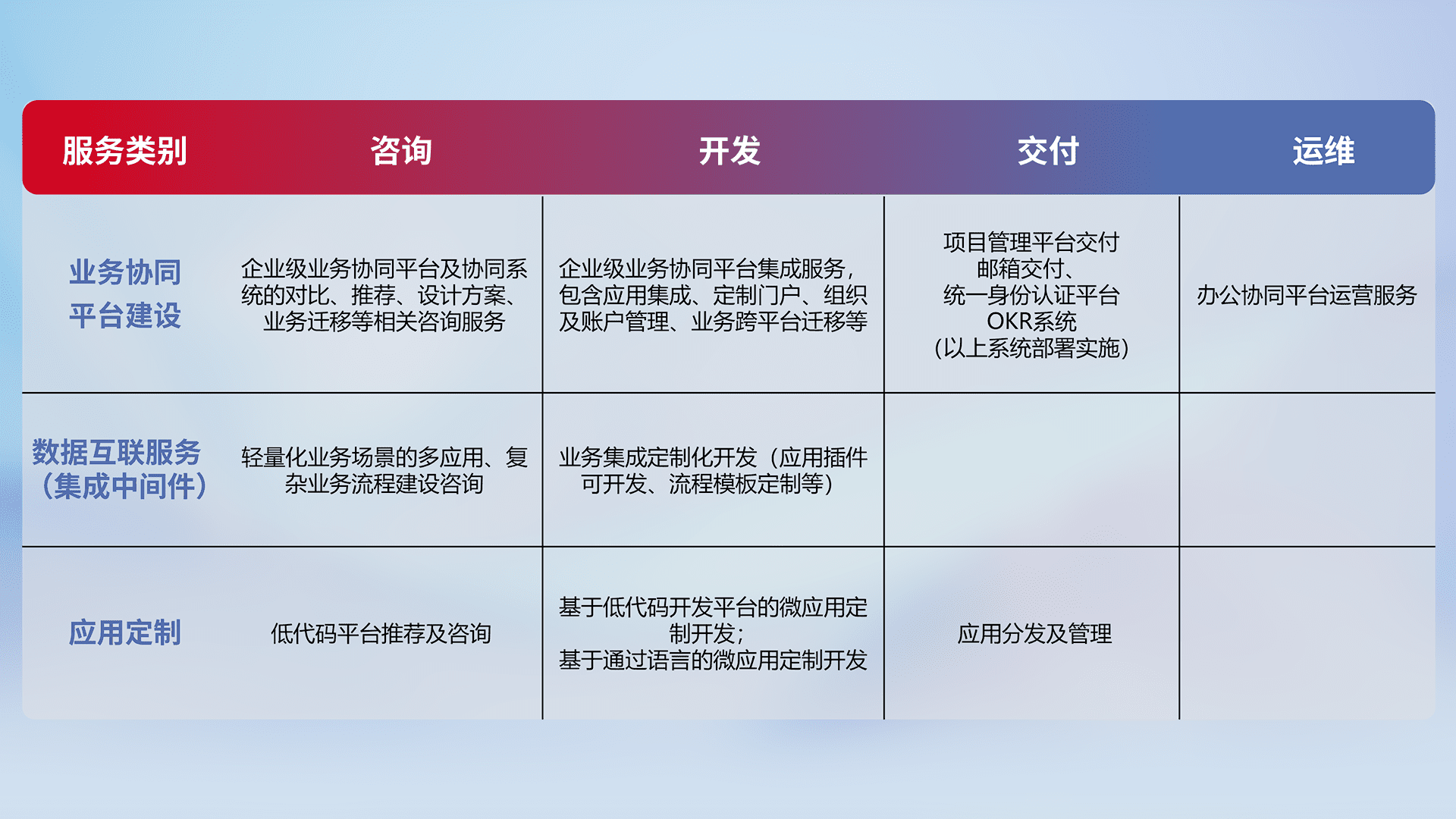 针对钉钉、、、企微、、IDaas等平台级产品提供产品的规划、、、方案、、交付、、定制化开发等服务,,,,实现如统一协同办公、、智能客户服务、、、混合会议管理、、、、智能数据查询、、、、等业务场景,,实现数字化转型。。。。